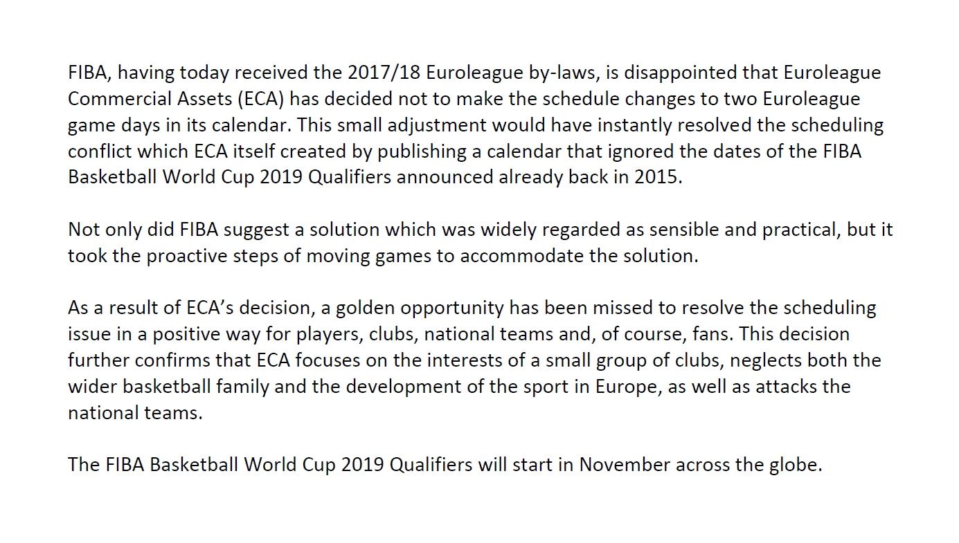 “Η FIBA λαμβάνοντας σήμερα την απόφαση της Euroleague εκφράζει την απογοήτευσή της για το γεγονός πως δεν έγιναν δεκτές οι προτάσεις της για μεταφορά των αγώνων της διοργάνωσής της σε δύο διαφορετικές εβδομάδες. Αυτή η πολύ μικρή αλλαγή θα είχε δώσει άμεση λύση στο πρόβλημα του προγράμματος το οποίο η ίδια δημιούργησε αγνοώντας τις ημερομηνίες των προκριματικών του Παγκοσμίου Κυπέλλου οι οποίες έχουν ανακοινωθεί από το 2015.
